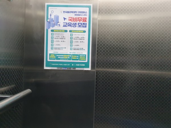 한국 폴리텍대학 아파트 엘리베이터 내부 및 현관 게시대 광고 개첨 사례 입니다..